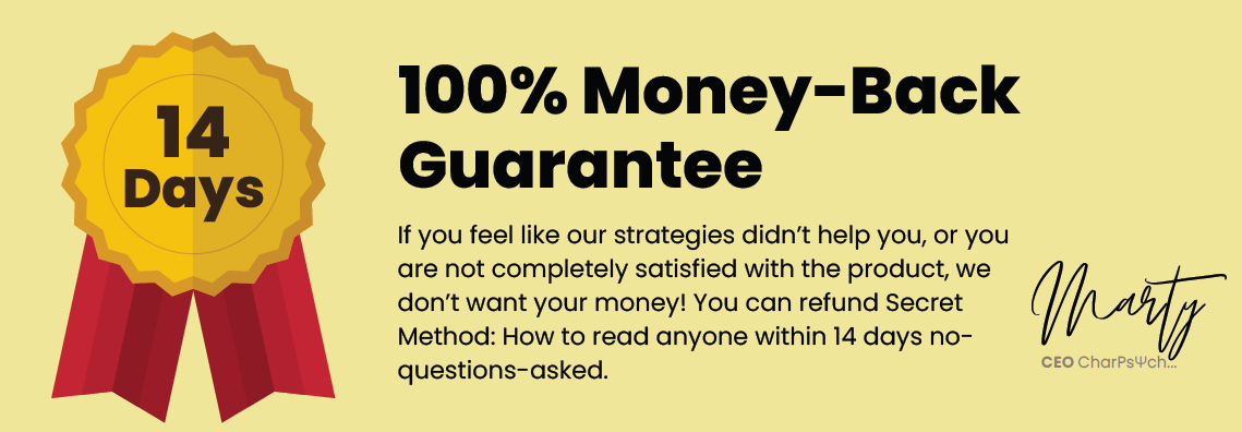 If you feel like our strategies didn’t help you, or you are not completely satisfied with the product, we don’t want your money! You can refund SECRET METHOD: How to read anyone within 14 days no-questions-asked.
